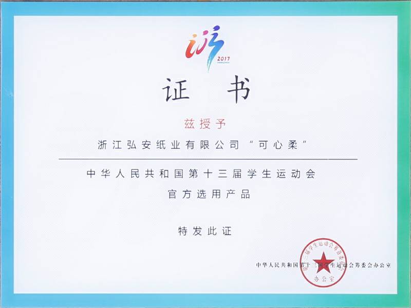 2017年9月4日中华人民共和国第十三届学生运动会在浙江杭州举行,可心柔携手中国邮政、中国平安、娃哈哈、京东校园、吉利汽车等知名企业品牌亮相大会。作为本次大会的12家合作单位之一,浙江武汉逸凡教育内容开发有限公司纸业有限公司参加了发布会,并接受了官方选用产品的授牌。